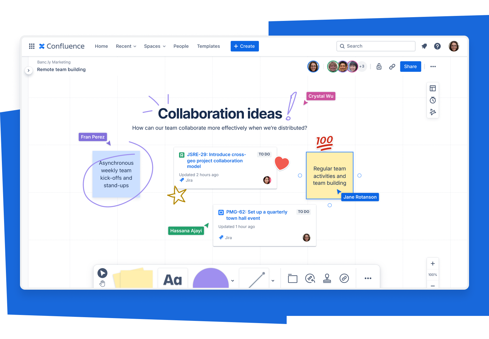 - Dễ dàng ghi lại màn hình và chính bạn để trả lời các vấn đề phức tạp, chia sẻ thông tin cập nhật và cung cấp phản hồi kịp thời, tất cả đều có trong Confluence.