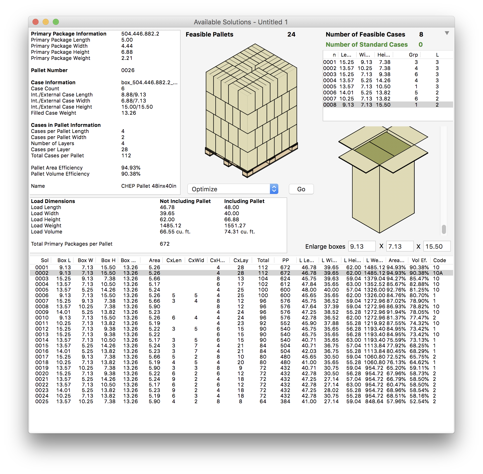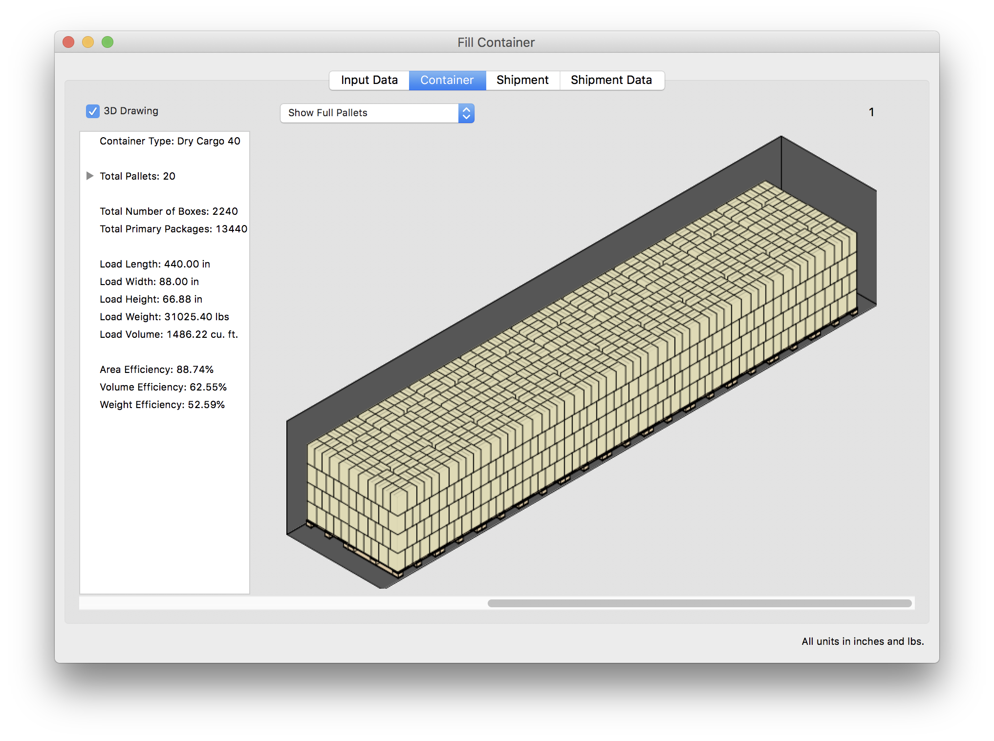 Sử dụng danh sách nhiều thùng carton và số lượng của chúng, Quick Pallet Maker có thể tính toán số lượng pallet cần thiết để hoàn thành một lô hàng. Sau đó, các pallet này có thể được nhóm lại và chất vào container. Dữ liệu có thể được nhập thủ công hoặc nhập từ bảng tính đã được cấu hình trước đó.